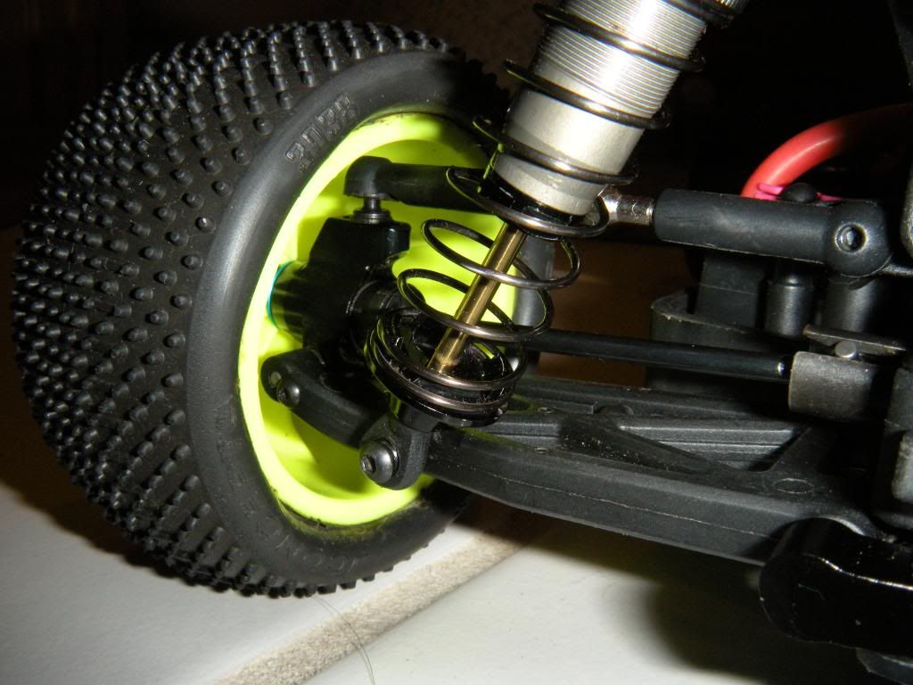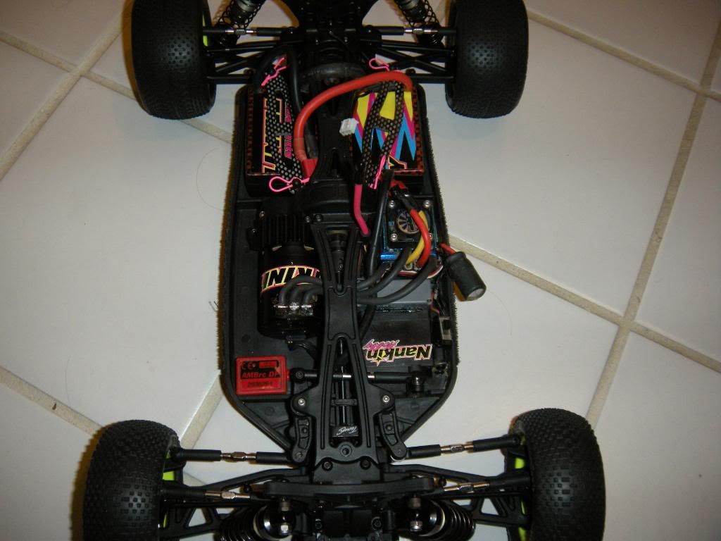 I was getting some PM's regarding pics of the inside of the 4wd and outside. Heres a couple for the people that asked. Dont mind my power cap hangin i was in the middle of doing something and didnt mount it.haha. Im running AE wheels out back and kyoshos up front. In the rear i just used the blue spacer that comes in the ae wheel conversion and the fit was perfect. The kyoshos up front fit without any modifications.